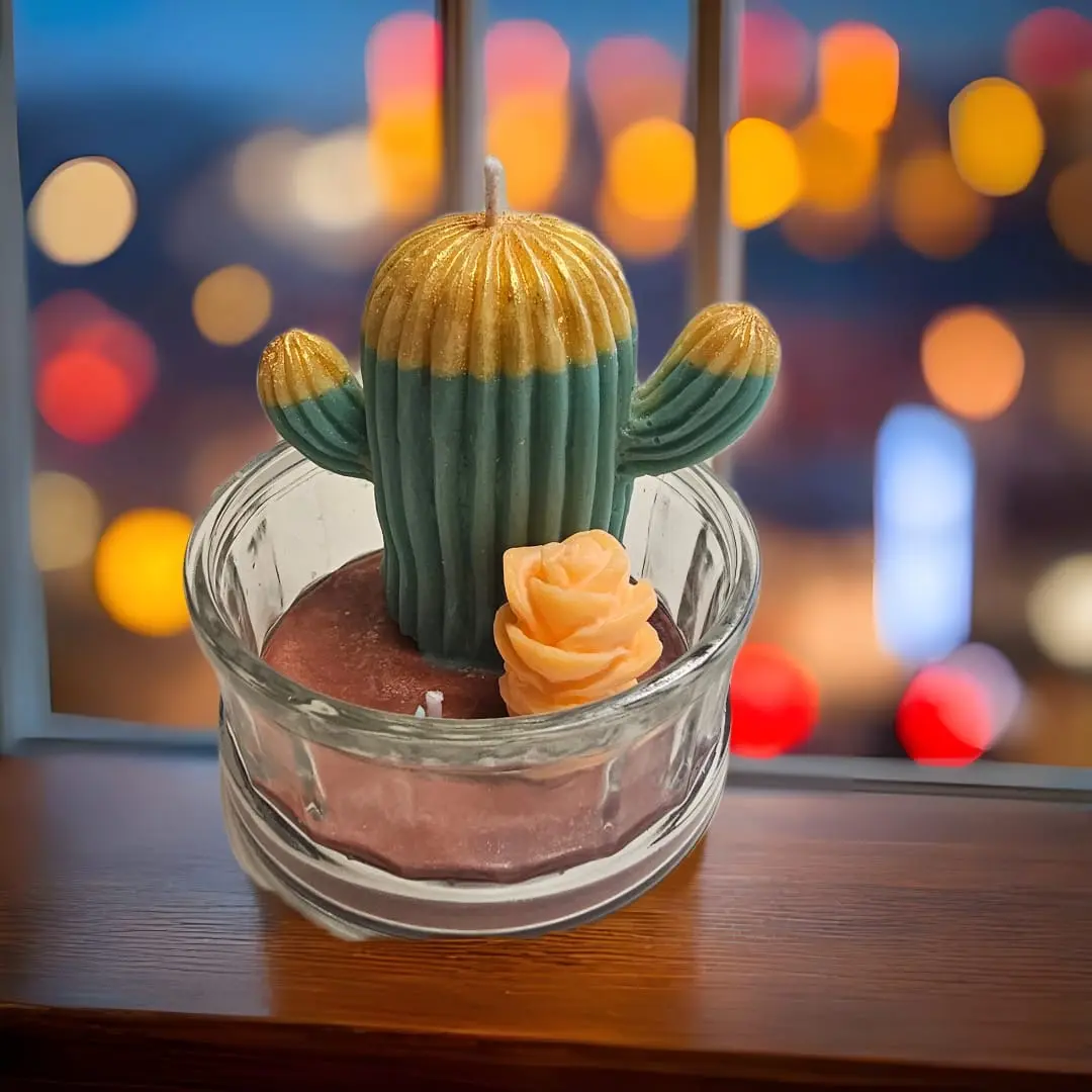 Una vela que mezcla la fuerza del cactus con la dulzura de una rosa, iluminada por un toque dorado que evoca la magia del atardecer.