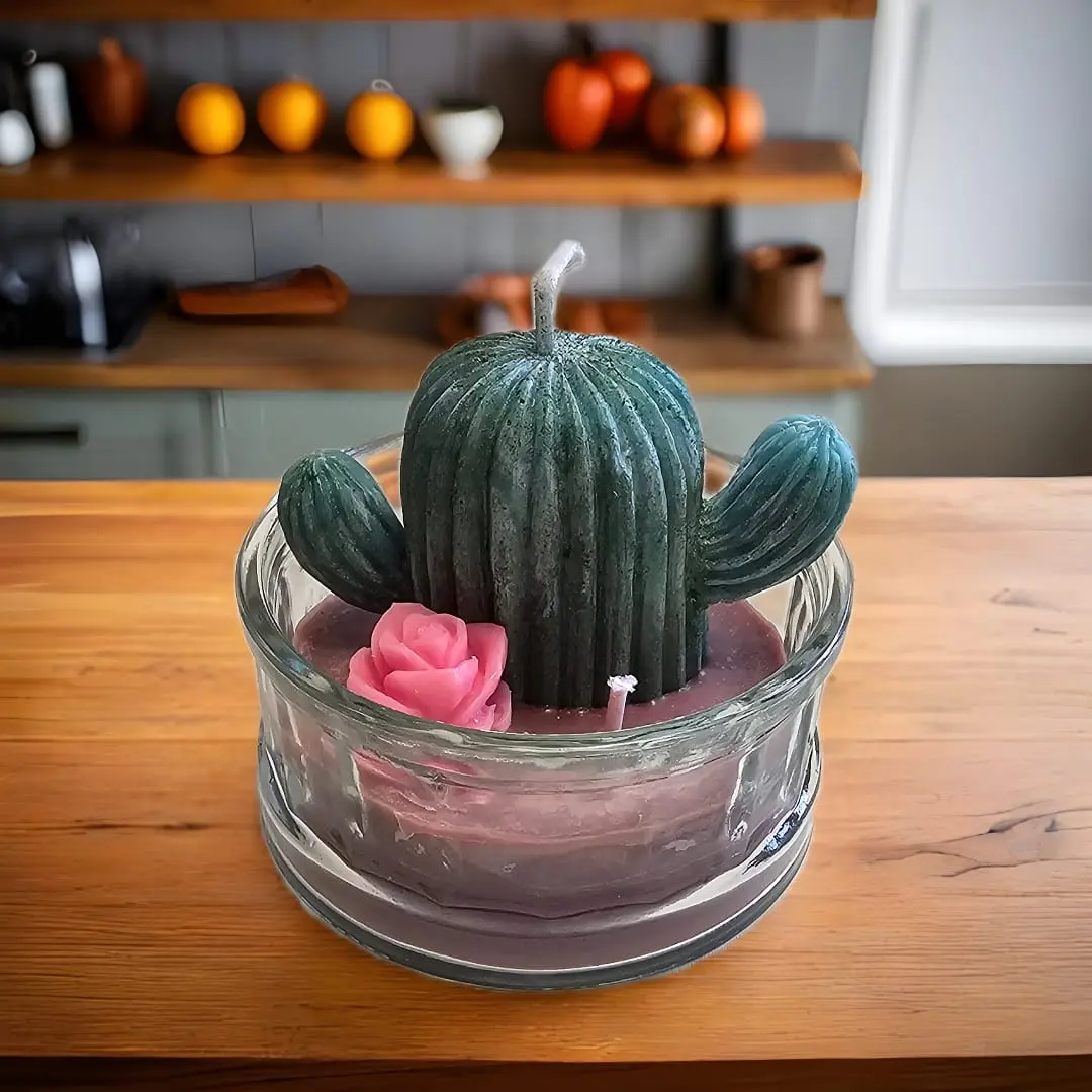 Inspirada en la belleza silvestre del desierto, esta vela artesanal con forma de cactus y delicadas flores en cera es una pieza decorativa llena de carácter y ternura.
