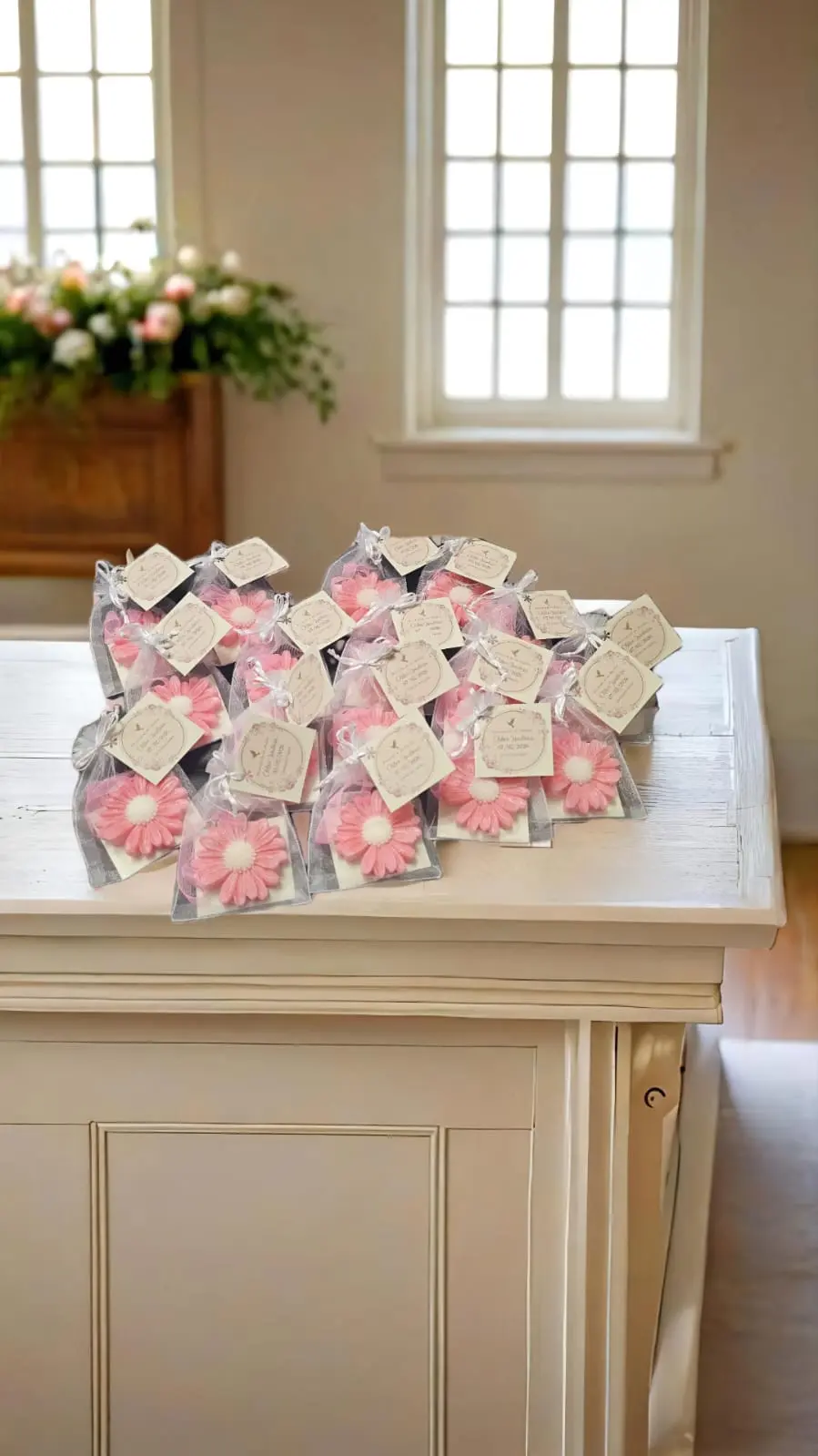 Delicados recuerdos artesanales en forma de flor, elaborados con amor para celebrar un momento único. Cada uno viene en su bolsita individual con etiqueta personalizada, ideal para bautizos, baby showers o primeras comuniones. Un detalle tierno y elegante que deja huella en el corazón de quienes lo reciben.
